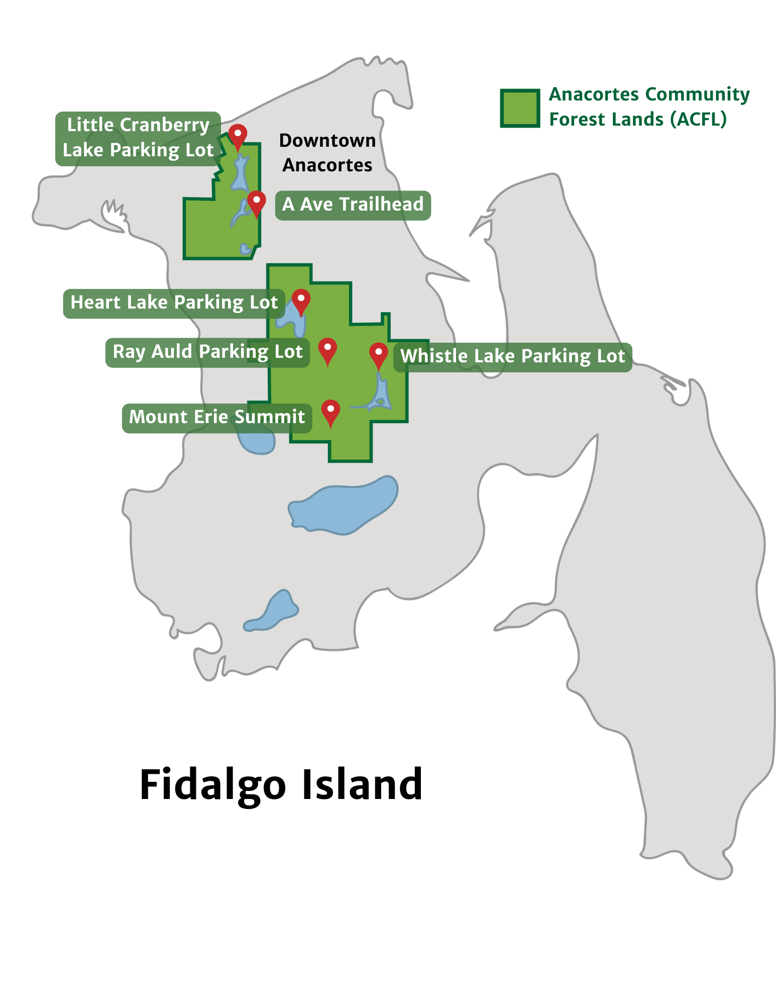 Trail maps of the ACFL are published by the Anacortes Parks & Recreation Department. In addition to topographical features and trails, the maps include a brief history of the ACFL, trail regulations, and information about how you can help protect this invaluable community treasure.